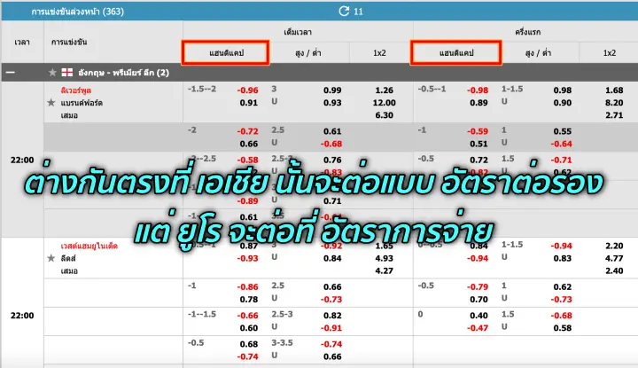 ราคาแบบ ยุโรป หรือ โหมดยูโร ในเว็บเรานั้น จะไม่ได้ต่อแบบ ครึ่งลูก แบบที่คุ้นเคยกันครับ แต่มันจะเป็น แฮนดิแคป แบบที่ต่อในอัตราการจ่ายนั่นเอง