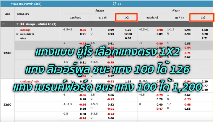 ราคาบอลแบบนี้สามารถเลือกเล่นได้ในโหมด 1X2 แบบที่เห็นในรูปนั่นแหละครับ ในรูปถ้าแทง ลิเวอร์พูล ชนะจะจ่ายที่ 1.26 หรือแทง 100 จ่าย 126 บาท รวมทุนแล้ว แต่ถ้าแทงว่า เบรนท์ฟอร์ด ชนะ จะจ่ายสูงถึง 12.00 หรือ แทง 100 จ่าย 1,200 นี่ครับมันเรีบกว่า แฮนดิแคป แบบ ยูโร มันต่อกันแบบนี้