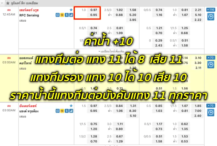 ราคานี้จะบังคับให้เล่นทีมต่อที่ 11 เราบอกเจ้ามือแทง 10,000 แต่ค่าน้ำ +10 เจ้ามือจะถือว่าเราแทง 11,000 บาท
